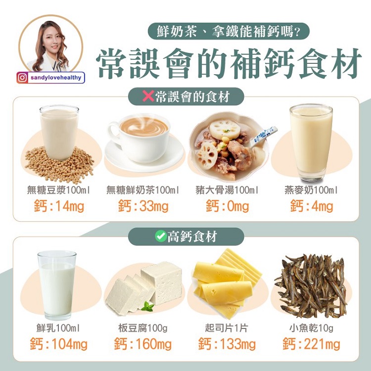 愛健康營養師珊珊指出,確實,這些飲料有使用鮮奶理論上應該可以多少補到一些鈣質,但根據台灣食品成分資料庫顯示,鮮奶茶的鈣質含量約33mg/100ml,再加上茶類、咖啡本身會影響鈣質吸收,其實不是補鈣的好食物!