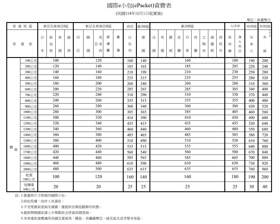 國際e小包(ePacket)資費表。圖/中華郵政提供責任編輯/施佳宜