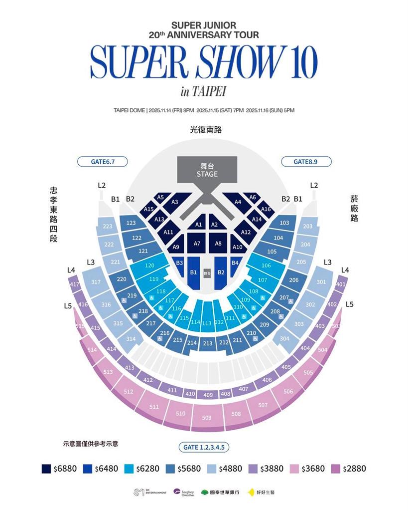 Super Junior大巨蛋演唱會座位圖。圖/翻攝自遠雄創藝 Farglory Creative臉書遠雄創藝指出「這是SUPER JUNIOR想再留給E.L.F.的位置,也是屬於每一個想親眼看見、親耳聽見的E.L.F.的席位」,不過他們也提醒加開的位置是視線遮蔽區,「請於購買前審慎考慮該區視線狀況,確定可接受再行購票。現場不接受以『無法觀賞主舞台LED及兩側螢幕』或『因硬體設備及欄杆』的視線遮蔽以及聲量過大為由申請退票或換位,感謝您的體諒。」