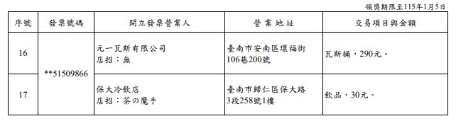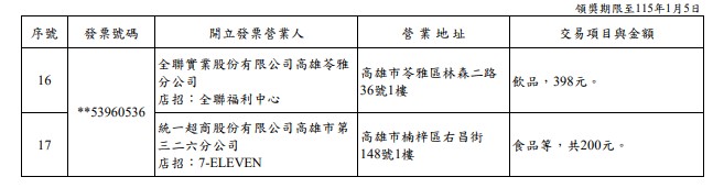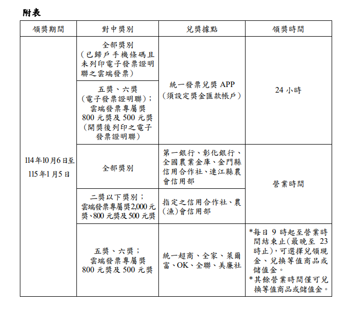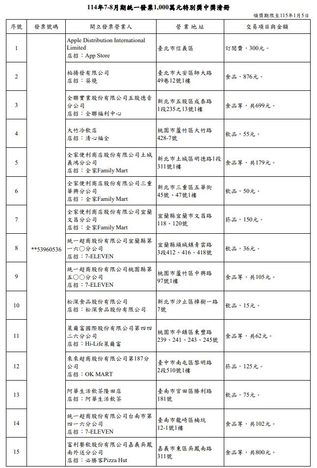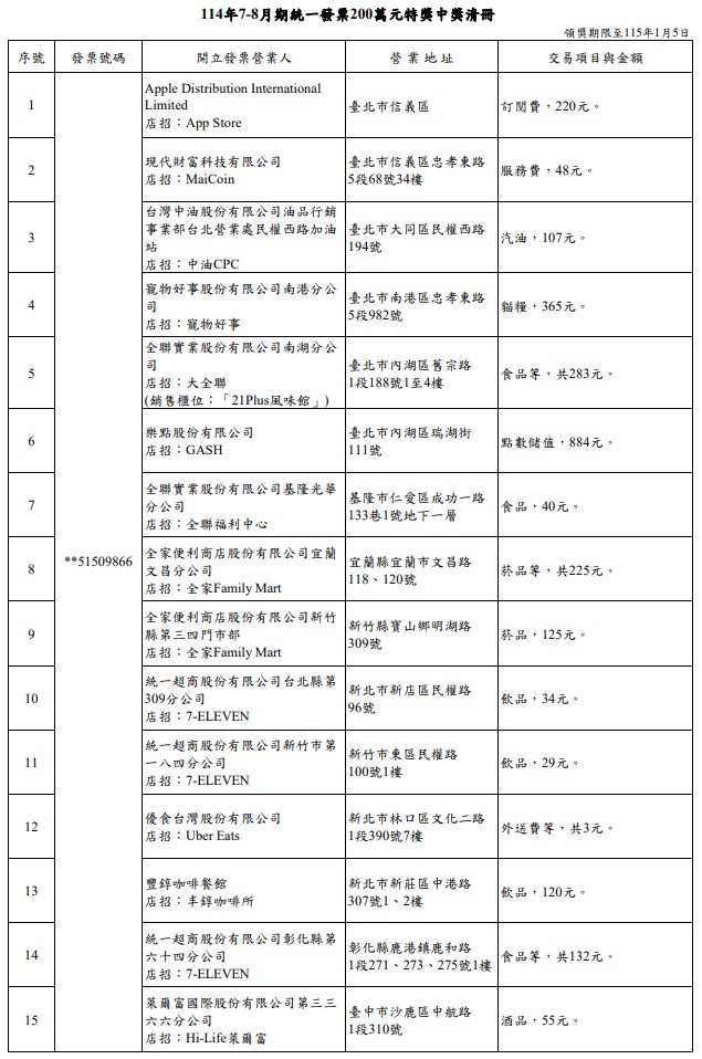 114年7-8月期統一發票200萬元特獎中獎清冊。圖/財政部提供此外,財政部賦稅署提醒,114年7-8月期中獎統一發票領獎期間為114年10月6日至115年1月5日,中獎人於該期間內依附表所列之兌獎據點及領獎時間領獎,使用載具儲存雲端發票(會員載具需於開獎前完成歸戶),且未列印出電子發票證明聯者,可透過「財政部統一發票兌獎APP」設定領獎帳戶兌領全部獎項,並可免繳印花稅;開獎後列印出中獎電子發票證明聯或消費時索取電子發票證明聯者,透過該兌獎APP只能兌領五獎、六獎、雲端發票專屬獎800元獎及500元獎。