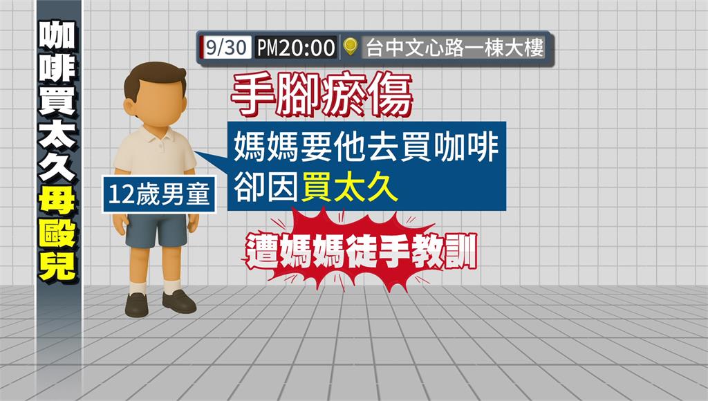 台中市再度傳出兒童虐待案件,這次受害的是一名年僅12歲的男童,事發於9月30日晚間8點多,文心路上一棟大樓內,據了解,男童表示,是因為母親要他外出買咖啡,但「買太久」導致母親不滿,憤而對他動手毆打。