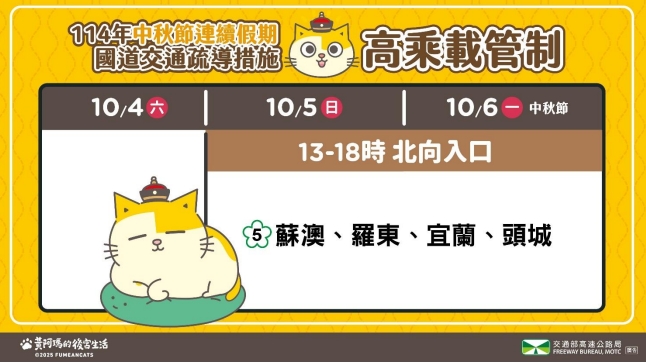 中秋連假將有高乘載管制。圖/翻攝自高公局網站高公局指出,假期首2日平均訂房率前3高之縣市依序為新北市、台北市及苗栗縣。高速公路局預估中秋節連假車流以返鄉及旅遊為主,尖峰時段部分路段易有壅塞狀況。