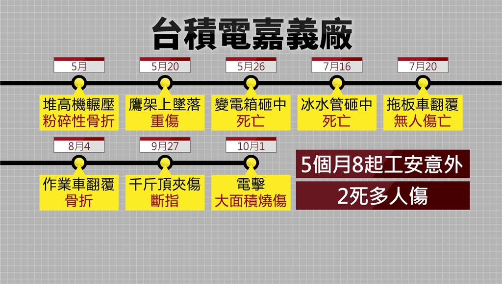 不過台積電嘉義廠工地意外頻傳,5月份1名工人遭堆高機輾過,同月20號外牆工人從鷹架墜落重傷,26號變電箱吊掛時砸死1名工人,7月16號有工人遭300公斤重的機電用冰水管砸中身亡。而後三個月又發生拖板車翻覆、高空墜落以及千斤頂夾斷手指的意外,如今再度傳出工人遭高壓電擊,再度引發各界關注。