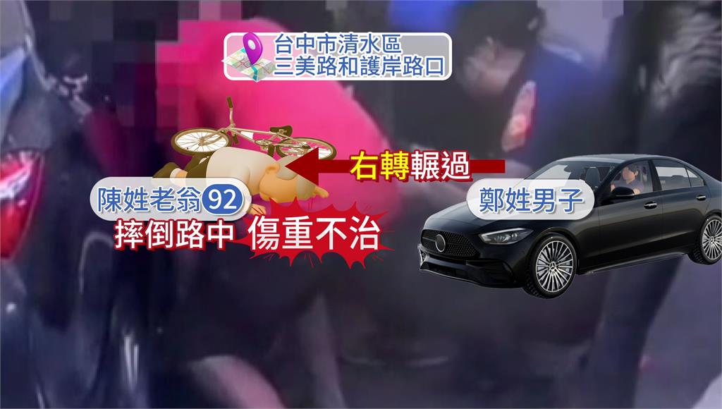 事發於台中市清水區,當時35歲鄭姓駕駛一輛黑色轎車,行經三美路與護岸路口準備右轉時,恰巧92歲陳姓老翁騎自行車經過該處,疑似重心不穩,連人帶車跌倒在車道中央,鄭男未察覺老翁倒地,不慎駕車輾過,隨後駕駛驚覺輾到人後,立即下車查看,發現老翁受困車底馬上打電話報警。
