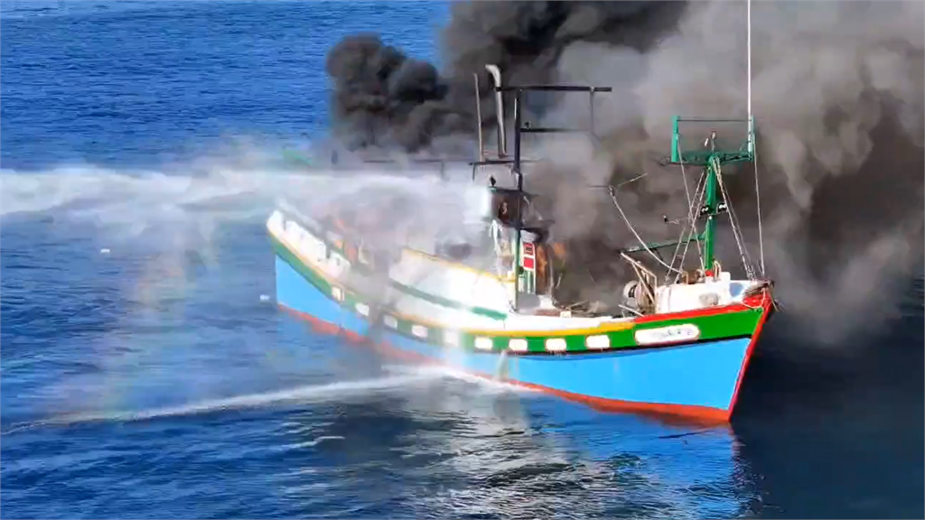 海巡靠近噴射長長水柱撲滅火勢。圖/民眾提供這起火燒船事件發生在3號早上將近7點半,名為「金漁滿」的漁船不明原因起火燃燒,外木山安檢所所長表示,在執行守望勤務時發現船隻起火,隨即通報並派遣海巡人員前往處理。
