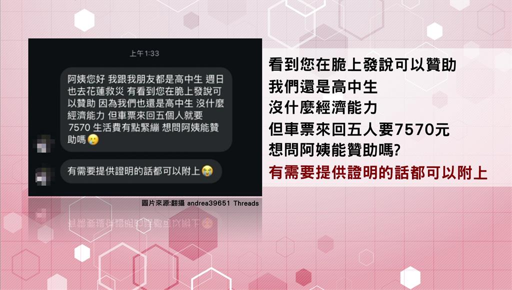 自稱高中生的網友傳訊提出車票贊助需求。圖/台視新聞製圖從曝光的對話紀錄看到,網友自稱是高中生沒什麼經濟能力,往返花蓮光復的車票5人要7570元,詢問對方能否贊助嗎?需要提供證明的話都能附上。