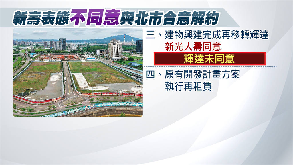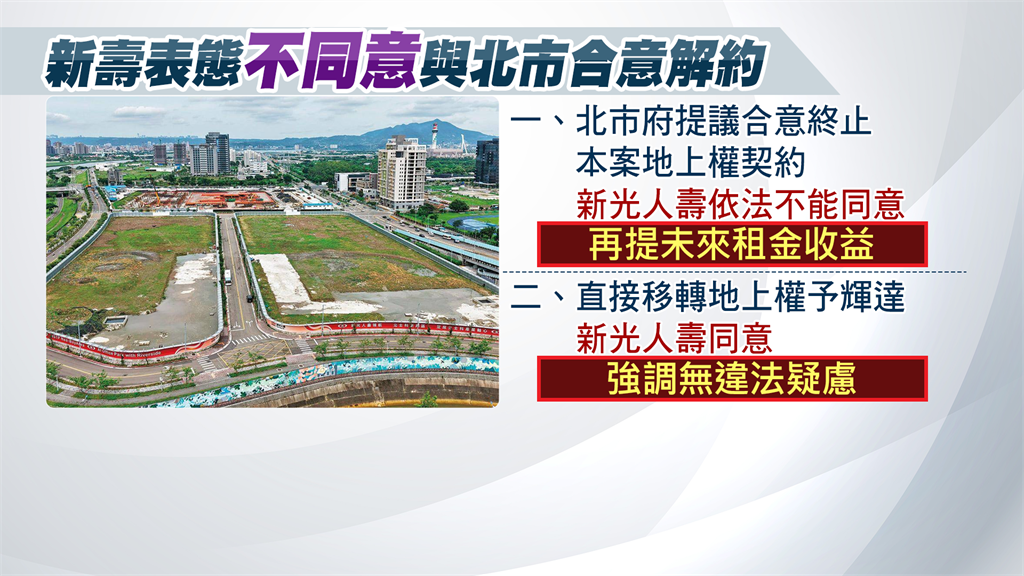 新光人壽2日發出四大聲明,第一,北市提議合意解約,但新壽依法不能同意,再提未來租金收益,疑似暗指市府解約金太低;還說直接移轉地上權,新壽同意沒有違法疑慮;至於由新壽興建廠房後再移轉,輝達卻是不同意;但跳過解約「直接移轉地上權」違法與否,卻與北市見解天差地遠!
