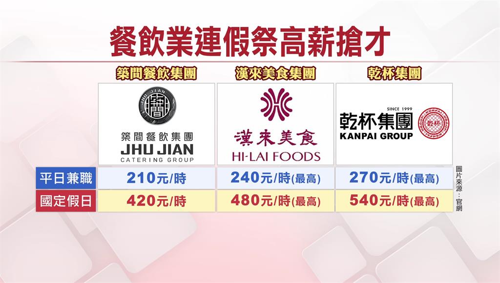 每到放假,大量民眾湧入各大餐廳及美食街,打工族缺錢、餐廳也正好缺工,部分餐飲集團拉高價碼,築間平日兼職時薪開到210元、國定假日420元;漢來美食最高時薪達240元,國定假日也翻倍;乾杯集團則是時薪最高270元,國定假日直接破五百,遠遠高於基本工資。