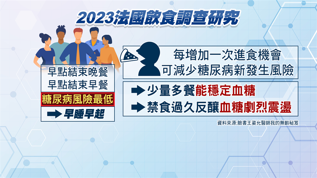 另外醫師也提到,過往認為少量多餐會刺激胰島素,但其實每增加一次進食機會,都可減少糖尿病新發生風險,少量多餐能穩定血糖,禁食過久,反而會造成血糖劇烈震盪。