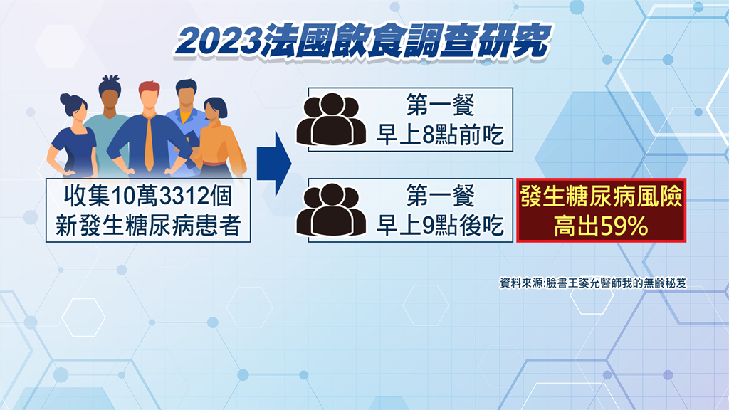 幾點吃早餐竟跟糖尿病息息相關!醫師王姿允分享一份法國飲食調查研究,他們收集10萬3千多位新發生糖尿病患者,結果觀察到第一餐在早上9點後吃的人,相較早上8點前吃,發生糖尿病的風險會高出59%!
