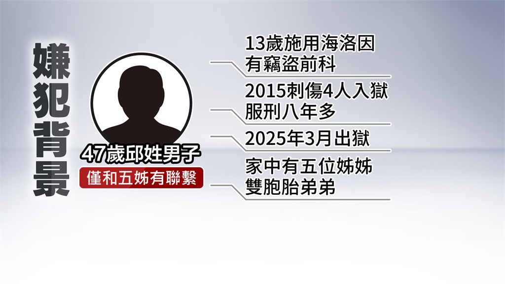 傷者家屬怒喊死刑。圖/台視新聞而起底47歲邱姓嫌犯,13歲就開始施用海洛因、有竊盜前科,2015年到超商隨機刺傷4人,服刑8年多,2025年3月出獄,家中有五個姊姊和一名雙胞胎弟弟,僅和五姊偶爾有聯繫。