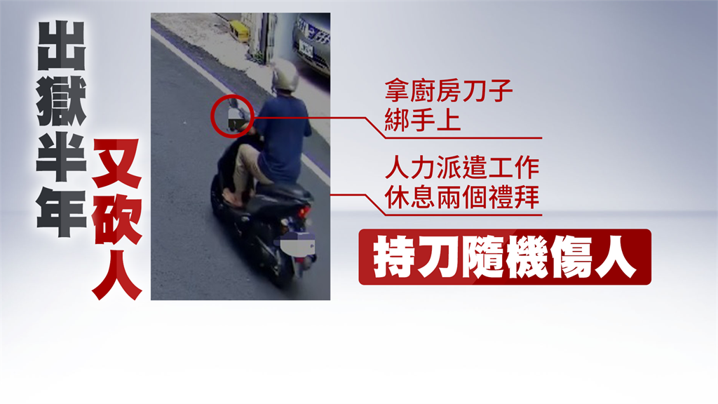 嫌犯手綁刀到路上隨機殺人。圖/台視新聞儘管邱姓男子出獄後,相關單位都會定時關心,但在9月第七次聯繫就失聯,出獄半年就再犯,對此矯正署也嚴厲譴責,盼結合各界資源,強化矯正效能,避免憾事再發生。
