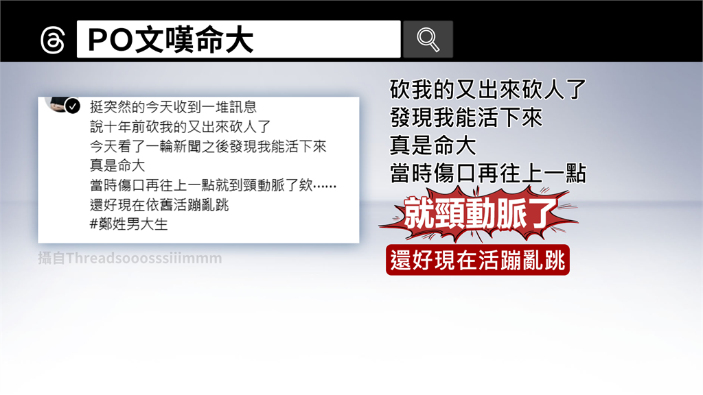 10年前遭砍男大生發文喊命大。圖/台視新聞不少網友驚呼,好消息是傷者順利活下來,壞消息則是嫌犯居然重蹈覆轍再傷人,而且這回還是對學童下手,受傷的徐姓女童母親表示,嫌犯再犯沒有得根治嗎?這樣大家怎麼安心?