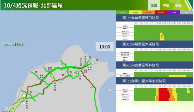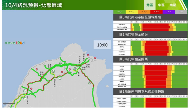 今(4)天是中秋3天連假首日,預估將有大量返鄉及出遊車潮,高公局估計,國道交通量將達平日1.3倍,來到118百萬車公里,其中有10處重點壅塞路段,建議西部國道南向用路人,儘量6時前或12時後出發,國5南向建議5時前或17時後出發。
