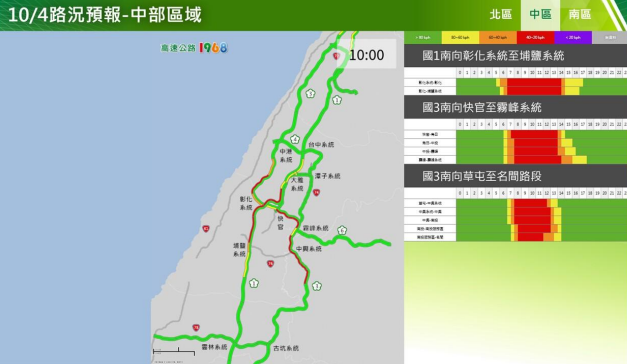 中秋節連假首日中部路段南向路況預報圖。圖/高公局提供
