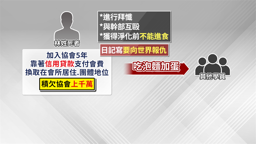 據了解,林姓死者加入協會5年,剛開始靠著信用貸款支付會費,換取在會所居住以及團體中地位,最後積欠協會高達上千萬,必須進行拜懺與幹部互毆,在獲得淨化前不能進食,死者眼睜睜看著其他人吃泡麵加蛋,餓著肚子在日記寫下「要向世界報仇」。