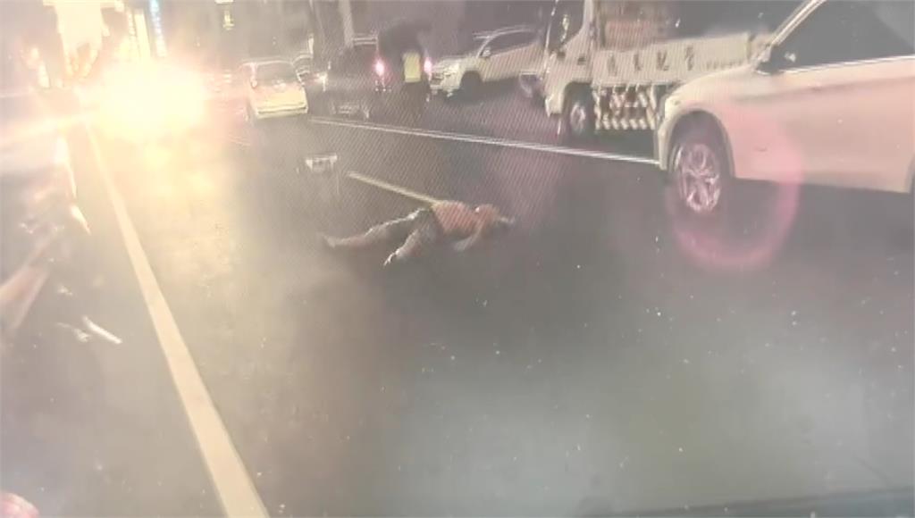 中秋連假才剛開始,新竹竹北一名男子喝茫後竟然躺在馬路中央,朋友還把烤肉架當三角錐,畫面看了相當危險!