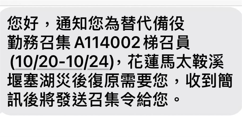 花蓮市公所誤發替代備役勤務召集通知給一般民眾。圖/翻攝自笛布斯顗賚臉書3日下午,花蓮市有不少民眾收到替代備役勤務召集通知簡訊,簡訊內明確寫著召集梯次編號、時間日期;而支援任務正是災後復原。但這封替代役動員令,收件對象,卻是「不分男女」,讓民眾霧煞煞,分不清訊息真假。