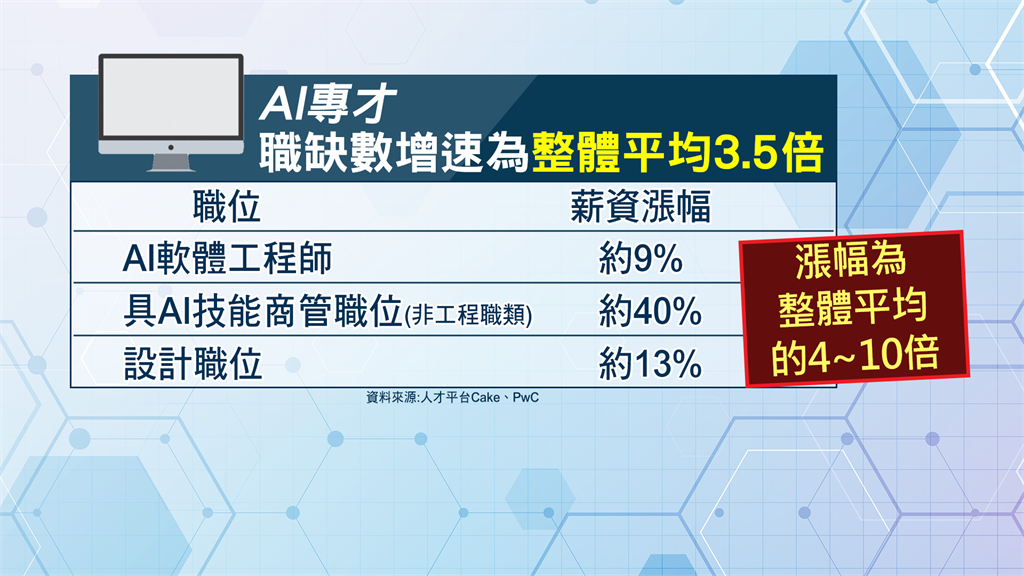 在人工智慧的浪潮下,不少企業展開AI搶才大戰,根據人力平台調查,具備AI技能的「商管職位」薪資漲幅高達40%,設計職位也成長13%,漲幅為整體平均的4到10倍,甚至有企業開出年薪300至400萬元,網羅AI領域專業人才,讓求職者積極卡位。