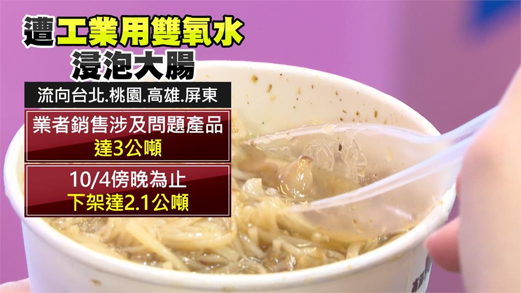 遭工業用雙氧水浸泡的豬大腸流向台北、桃園、高雄與屏東等地。圖/台視新聞根據食藥署調查,業者銷售涉及問題產品達3公噸,流向台北、桃園、高雄與屏東等地,截至4日傍晚,已下架2.1公噸。
