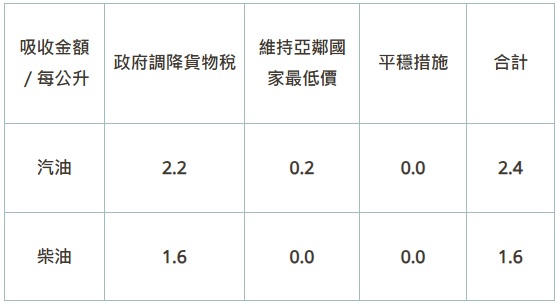 按浮動油價機制調整原則,汽油每公升應調漲0.2元、柴油應調降0.2元,惟為維持價格低於亞洲鄰近國家(日、韓、港、星),汽油吸收0.2元。