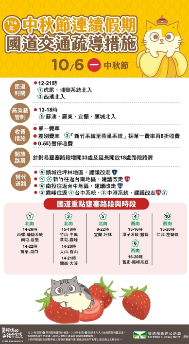 高公局提醒,明日國道相關疏導措施包括,12-21時封閉國1虎尾、埔鹽系統及國3西濱北向入口;13-18時國5蘇澳、羅東、宜蘭及頭城之北向入口高乘載管制;單一費率、差別費率、0-5時暫停收費、開放路肩、替代道路、匝道儀控等。