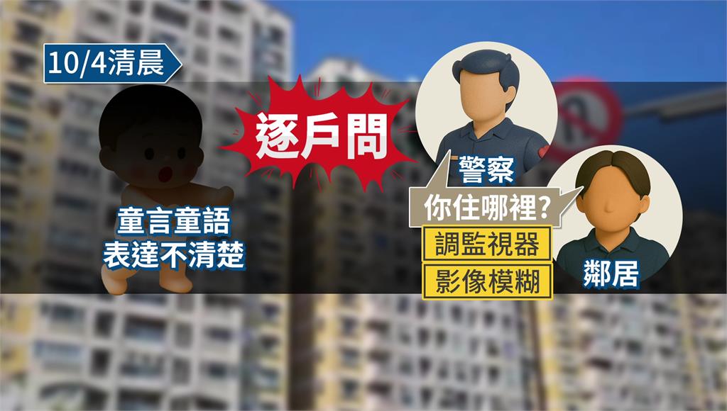 「童言童語」難倒警察,逐戶按鈴尋找「哪家的」。圖/台視新聞製圖