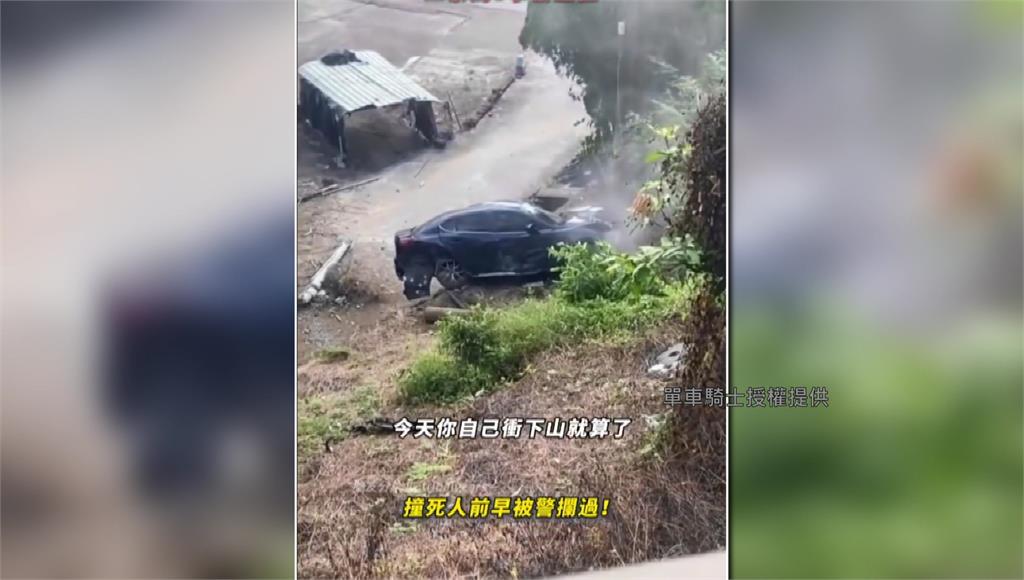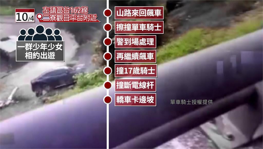 轎車撞上同行朋友的機車後,卡在邊坡。圖/單車騎士授權提供雙方都無照駕駛已令人詬病,現在又爆出在當天死亡車禍前就先出了小事故,就在台162線二寮觀日平台附近,這名18歲駕駛載著朋友在山路來回飆車,擦撞旁邊單車騎士。警方到場製單舉發,沒想到員警走後他無視繼續飆車,才又撞上17歲騎士,最後轎車卡在邊坡。