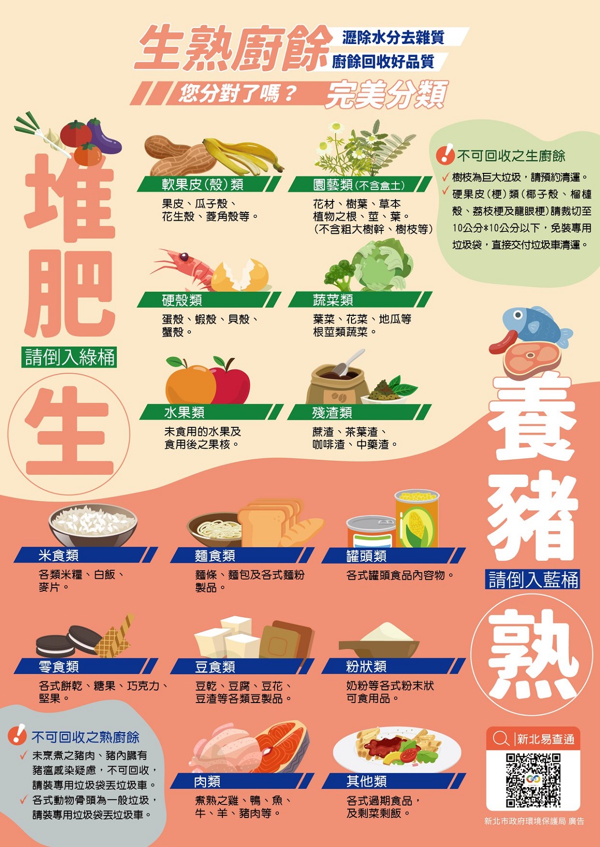 你是不是也以為—吃剩的魚刺、肉骨頭就是熟廚餘?新北i環保指出,其實它們屬於一般垃圾,請裝專用垃圾袋交給循線垃圾車!不小心分類錯誤,它們可能會刺傷養豬戶的寶貝豬做好正確的回收分類還在為廚餘怎麼分煩惱嗎?想要通通丟進同一袋嗎?千萬不可!新北i環保特別整理出廚餘分類對照表,無論是生廚餘還是熟廚餘,只要對照著看以後都不用為廚餘煩惱了! (記者吳珮均、圖片來源:Dreamstime/典匠影像)延伸閱讀:·粽葉、粽繩要丟「廚餘or一般垃圾」?環保局揭正確分類 鳳梨頭、竹筍殼、牡蠣殼也常被誤丟·藥沒吃完丟垃圾桶就好? 專家教你正確處理方法