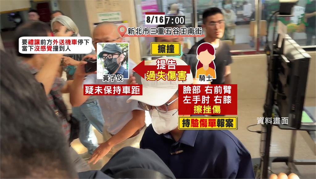 黃子佼被通知到案說明,但卻辯稱當時是要禮讓前方的外送機車才停下,根本沒感覺撞到了人,所以才直接離開,受傷女騎士完全不接受這樣說詞,決定提告過失傷害。