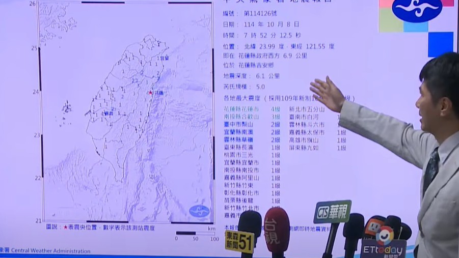 (更新時間11:44)今(8)日上午11時33分東部海域發生芮氏規模5.0地震,根據中央氣象署測報資料顯示,震央在花蓮縣政府東南方68.4公里,地震深度28.9公里。其中,花蓮縣、台東縣最大震度3級、台南市、南投縣、宜蘭縣、台中市、嘉義縣、彰化縣、新竹縣最大震度1級。地震報告。圖/中央氣象署責任編輯/馮康蕙