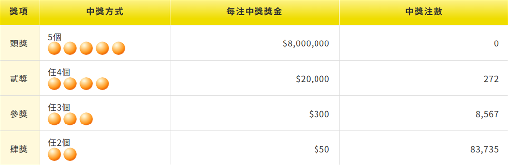 今彩539派彩結果出爐。圖/台視新聞(資料畫面) 台灣彩券今(8)日開出第114000244期「今彩539」,中獎號碼為 03、09、26、38、39,台彩公告,本期頭獎無人中獎,貳獎則開出272注,每注可獲得獎金2萬元。「今彩539」第114000244期派彩結果。圖/翻攝自台彩官網責任編輯/蔡尚晉