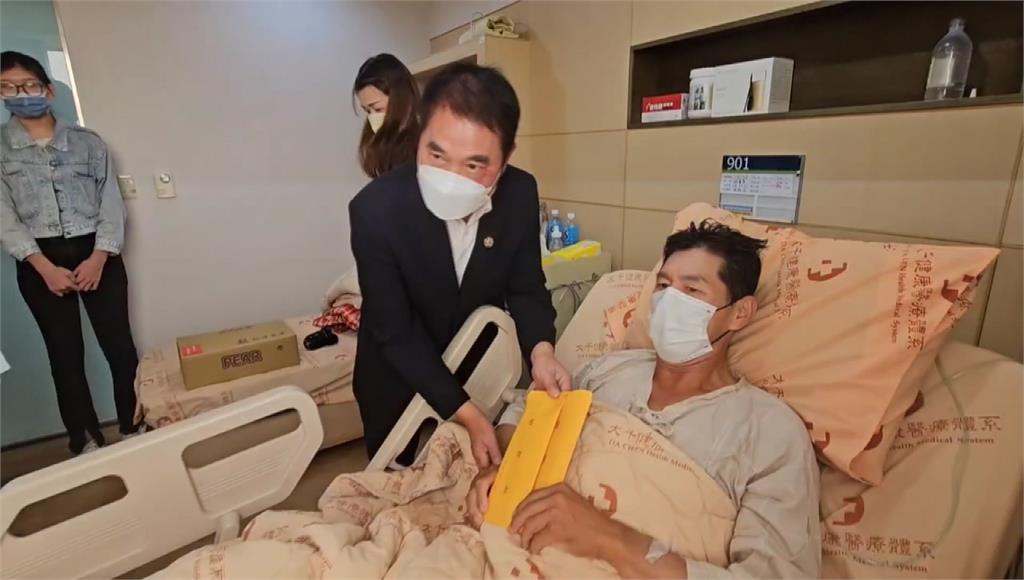 鍾東錦親自赴醫院送上慰問金。圖/台視新聞這回要不是從事鐵工的50歲林姓男子擋在女童前面,後果不堪設想。苗栗縣長鍾東錦親自赴醫院慰問,表示社會上大家都很關心他,對他的見義勇為非常稱讚,除了提供慰問金,也允諾相關醫療費由縣府買單,後續也會持續關懷。