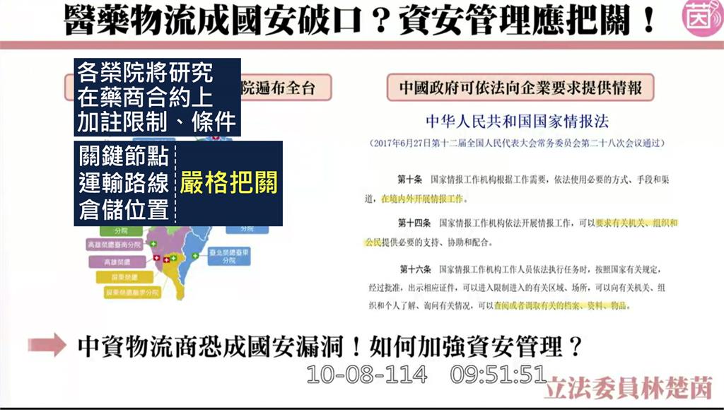 除了北榮以外,林楚茵也點名台中、高雄、屏東榮總,要全面盤點現有合約,尤其醫藥物流牽涉民眾生命安全與戰時應變能力,如何防堵被紅色供應鏈滲透考驗政府把關能力。