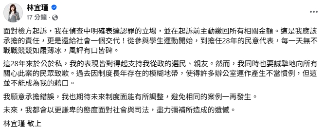 林宜瑾發文道歉。圖/翻攝自林宜瑾臉書林宜瑾稱自己從政來的表現,皆對得起選民、親友,「我也要誠摯地向所有關心此案的民眾致歉。過去因制度長年存在的模糊地帶,使得許多辦公室運作產生不當慣例,但這並不能成為我的藉口,我願意承擔錯誤,我也期待未來制度面能有所調整,避免相同的案例一再發生。未來,我都會以更謙卑的態度面對社會與司法,盡力彌補所造成的遺憾。」