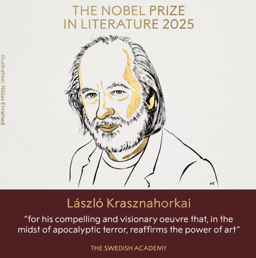 2025年諾貝爾文學獎(Literature)在台灣時間9日晚間7點揭曉,本次得獎者是匈牙利小說家卡撒茲納霍凱(László Krasznahorkai)。諾貝爾委員會讚譽他的作品「因其引人入勝且富有遠見的作品,在世界末日的恐怖之中,重申了藝術的力量」。