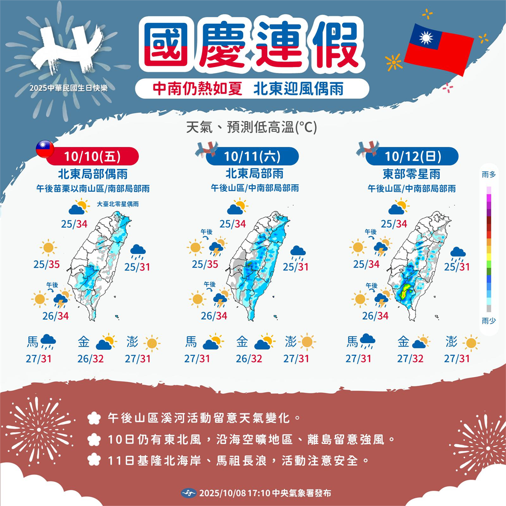 國慶連假天氣預報。圖/翻攝自中央氣象署明天起將迎來3天國慶連假,氣象署預報,國慶日(10日)當天,雙北、東半部地區有零星降雨,午後南部地區也有局部短暫雷陣雨,到了11號,東半部也得留意降雨機率,12號環境改以偏東風、東南風影響,午後雷雨以中南部為主。溫度上,因東北季風減弱,溫度將進一步回升,西半部內陸近山區,有可能來到35甚至36度高溫。