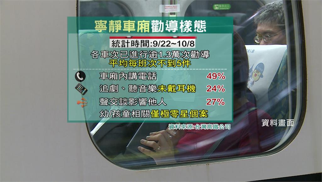 高鐵公布寧靜車廂勸導數據。圖/台視新聞(資料畫面)高鐵也公布寧靜車廂上路後,截至10月8日的統計數據,各車次已進行超過1.3萬次勸導,有近五成是在車廂內講電話,而未戴耳機、大聲講話都超過兩成,幼童、孩童相關只有極零星個案,高鐵公司呼籲社會包容孩童,請旅客多發揮同理心。