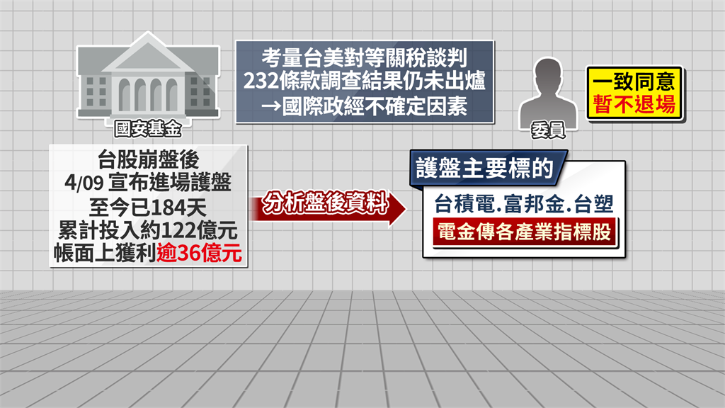 不過隨著台股創新高,原本外界推測國安基金會順勢退場,但國安基金在9日召開例會後點出,考量到台美對等關稅談判及232條款調查結果還沒定案,加上國際政經不確定因素,因此一致同意暫不退場。