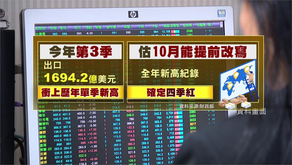 除了台股創高之外,我國出口表現持續亮眼,不但今年第3季寫下單季新高,財政部更預估,下個月還能改寫全年新高紀錄,今年出口確定「四季紅」。