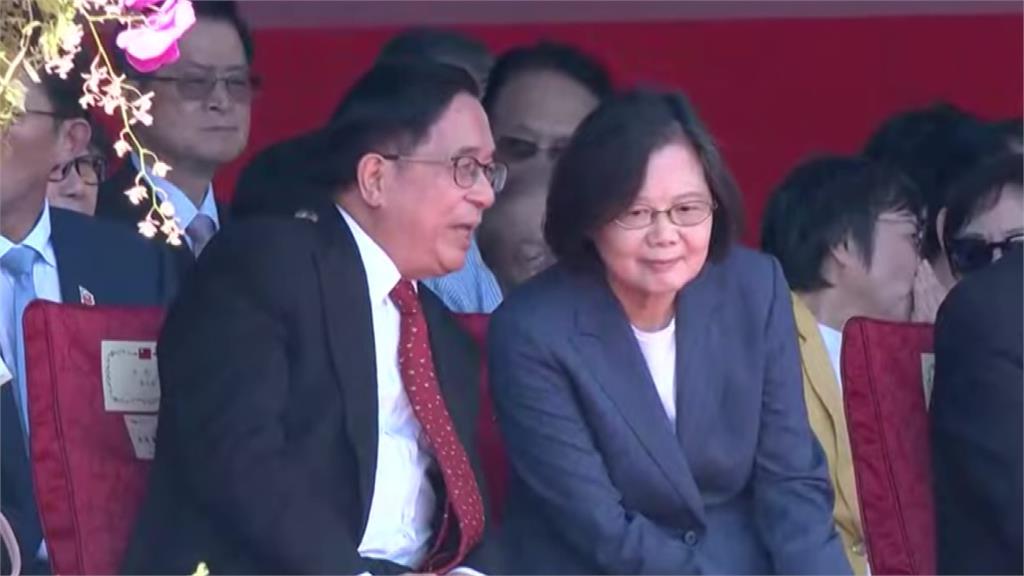 國慶大典的觀禮台上,前總統陳水扁、蔡英文與前副總統陳建仁坐首排,後方則是國民黨主席朱立倫、民眾黨主席黃國昌、親民黨主席宋楚瑜。