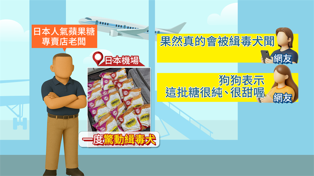 最後順利登機,但回到了日本機場,這些「白粉」又再度驚動緝毒犬,幸好順利通過檢查,讓不少網友開玩笑說,「果然真的會被緝毒犬聞」、「狗狗表示這批糖很純喔」!
