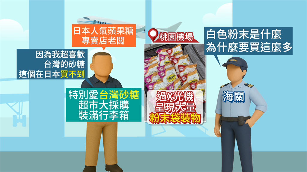 一名日本人氣蘋果糖專賣店的老闆最近來台旅遊,因為對台灣砂糖情有獨鍾,專程跑到超市大採購,還塞滿了行李箱,準備帶回日本,沒想到從桃園機場出境時,因為這些白色砂糖在X光機圖檔上呈現的是「大量粉末袋裝物」,先是被海關攔下來仔細詢問「這些白色粉末是什麼」、「為什麼要帶這麼多」?當下老闆解釋說,是因為台灣砂糖在日本買不到,這才化解這場白色粉末騷動。