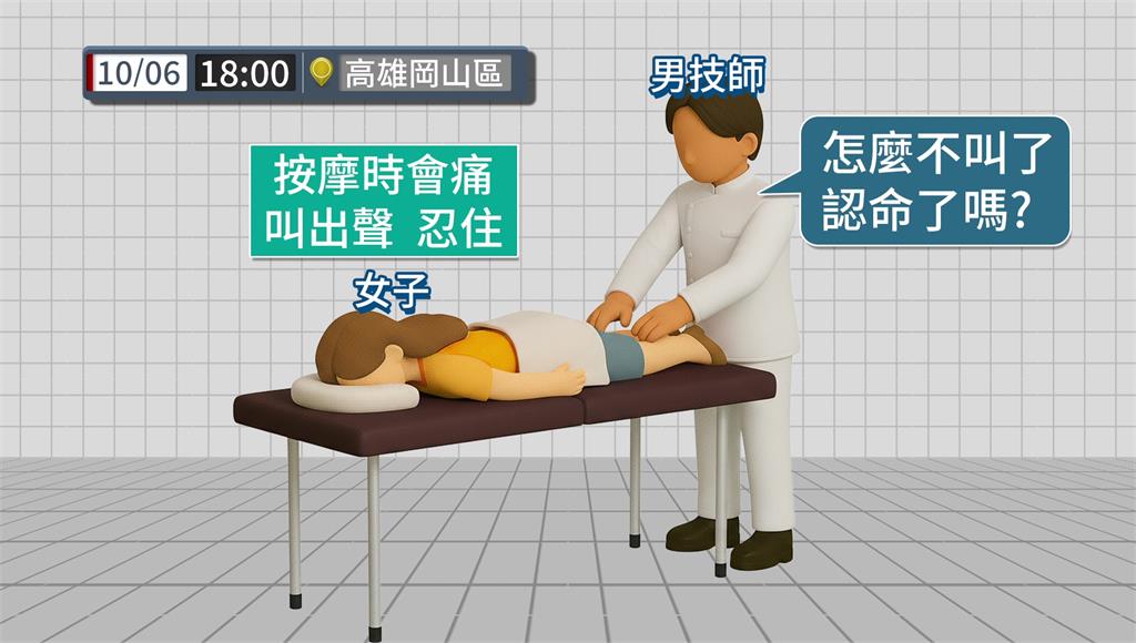 事發在6號晚間,高雄岡山區一名女子指控,被按摩時遭猥褻、性侵,且過程中她因很痛、不舒服,期間也一直拒絕,但沒想到技師卻回「你就算喊救命也沒有人會救你」、「怎麼不叫了,認命了嗎?」,讓女子相當崩潰。