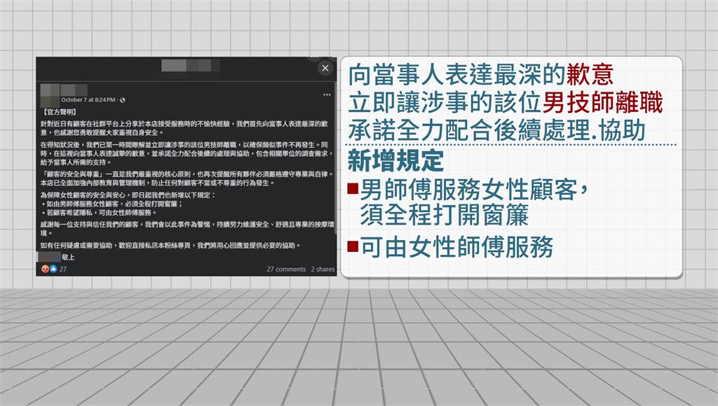 該店家PO文致歉。圖/台視新聞事件曝光後,有不少網友表示,都曾在這家連鎖按摩店遇過性騷,卻沒保留證據。這回嫌犯似乎趁著職務方便,向年輕女子伸出狼爪,有沒有觸法,檢驗結果出來就知道。