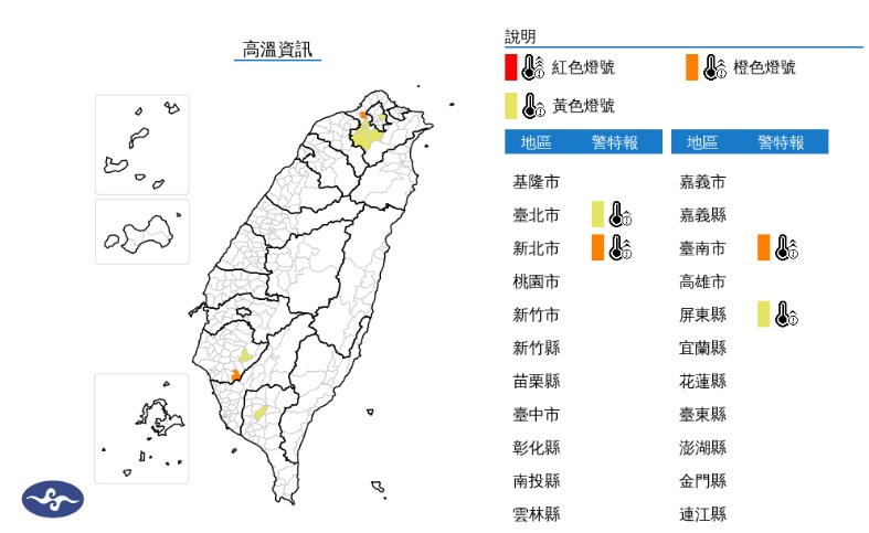 氣溫方面,中央氣象署發布高溫資訊,白天新北市亮出橙色燈號,有38度極端高溫出現的機率;臺南市為橙色燈號,有連續出現36度高溫的機率;臺北市、屏東縣則為黃色燈號,恐出現36度以上高溫。其餘地區部分,東半部高溫約落在31至32度;西半部高溫約32至35度。