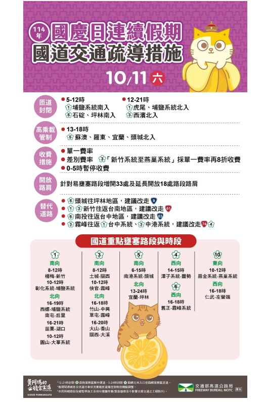 國慶連假進入第2天,高公局指出,截至今(11)日上午8時,全國道路大致正常。今日疏導措施包括,5至12時封閉國1埔鹽系統及國5石碇、坪林南向入口;12至21時封閉國1虎尾、埔鹽系統及國3西濱北向入口;13至18時國5蘇澳、羅東、宜蘭及頭城北向入口實施高乘載管制,另維持單一費率、差別費率、開放路肩、替代道路及匝道儀控等措施。