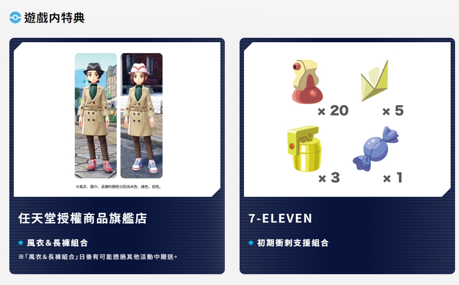 玩家如果在7-ELEVEN、任天堂授權商品旗艦店購買、預購遊戲的話,前者可以得到「初期衝刺支援組合」,內含好傷藥20個、活力碎片5個、萬靈藥3個、神奇糖果1個,後者將得到「風衣&長褲組合」(日後有可能透過其他活動中贈送)。