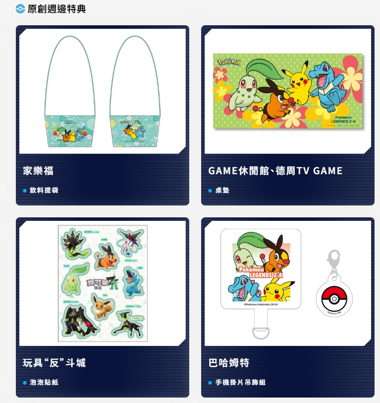 家樂福則是贈送「飲料提袋」;GAME休閒館、德周TV GAME贈送「桌墊」;玩具“反”斗贈送「泡泡貼紙」;巴哈姆特是贈送「手機掛片吊飾組」,另外在Pokémon Center TAIPEI購買的話則是贈送「寶可夢中心原創畫冊『Pokémon LEGENDS Z-A ART Book』」。