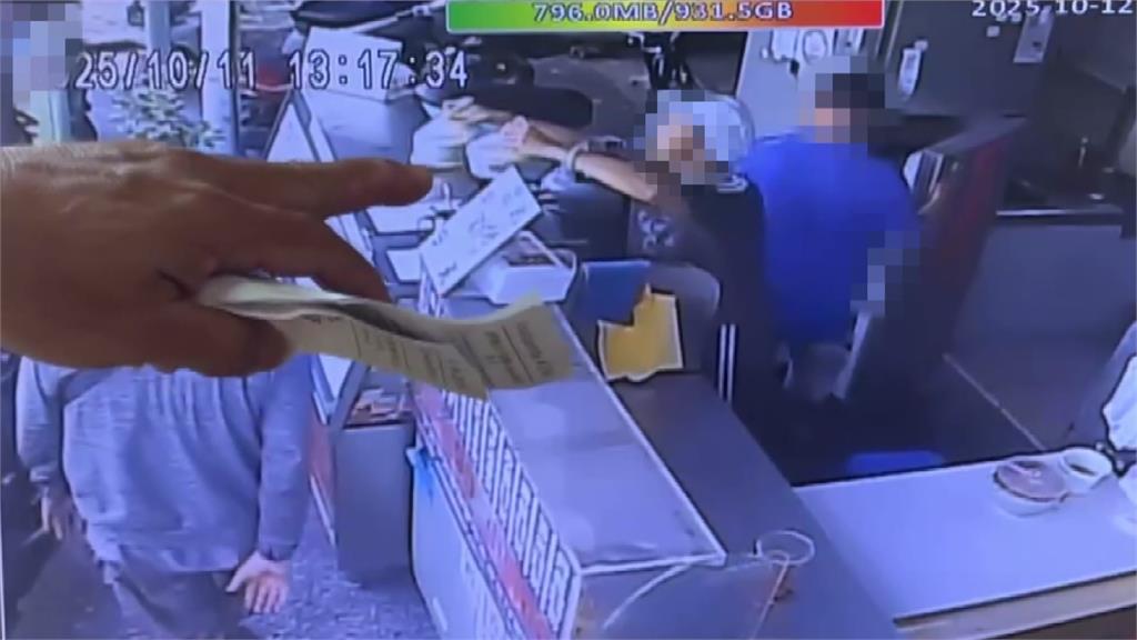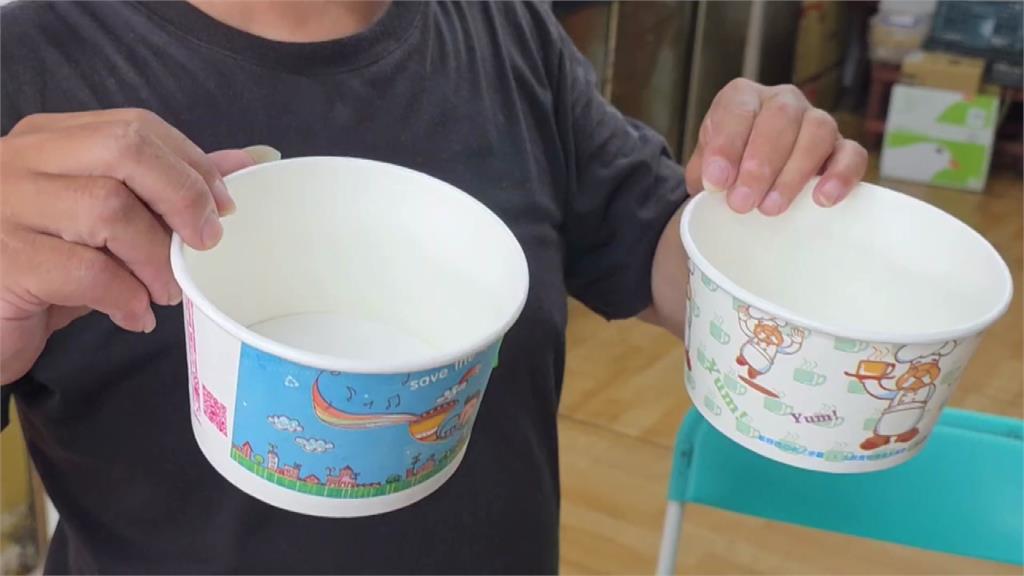 遭控店家調出監視器畫面自清,並秀出自家使用的外帶碗,表示不可能使用泡麵碗裝盛。圖/台視新聞遭指控的店家調出監視器畫面自清,強調自家外帶碗只有藍色和淺綠色兩種,絕對不可能使用該粉色泡麵碗。店家表示,「碗不一樣我們馬上就會發現,中間外送是不是發生問題還是怎樣,我們不可能特地去買一個泡麵碗來裝。」